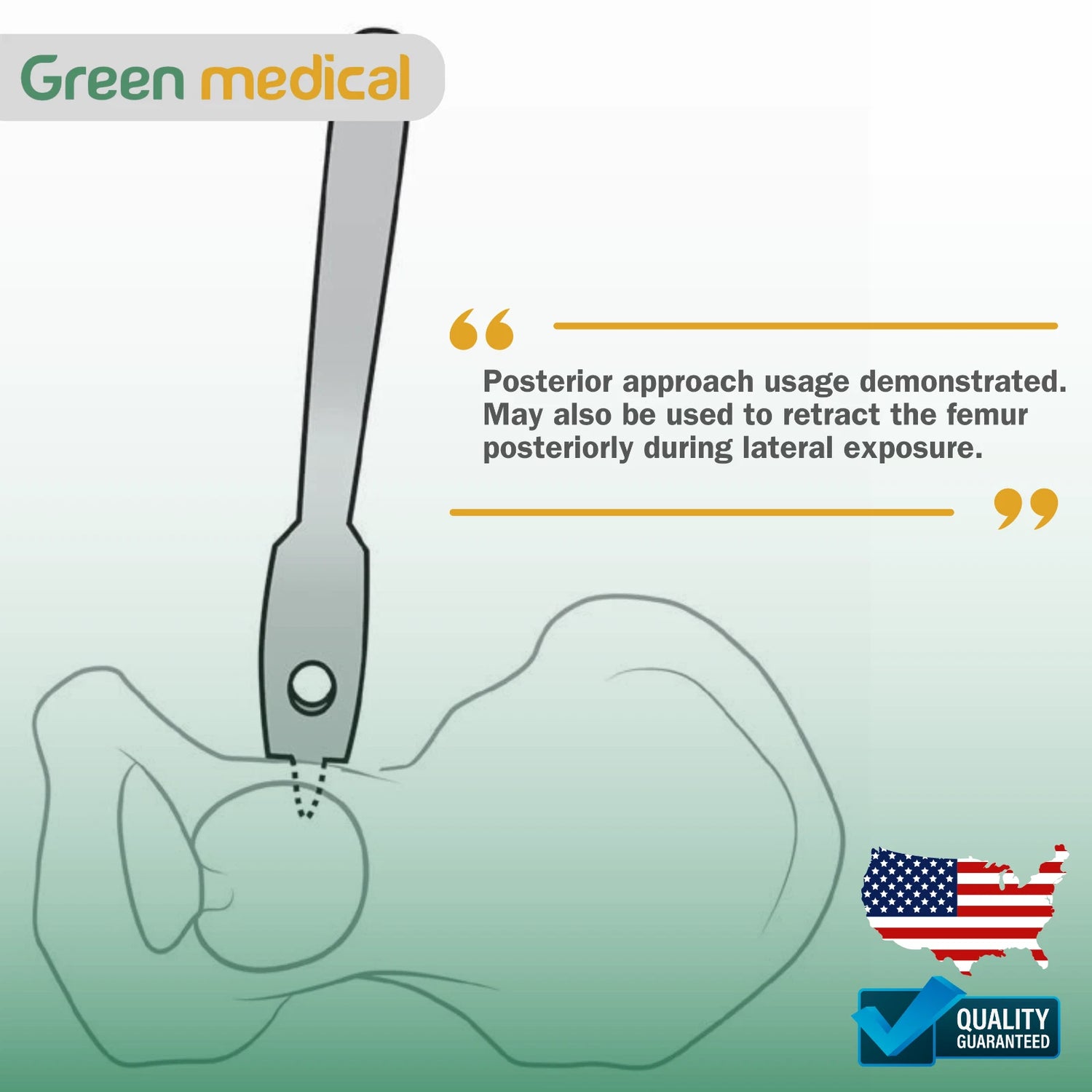 This retractor is an essential tool for orthopedic surgeons, combining strength, precision, and comfort to ensure successful outcomes in hip replacement procedures.