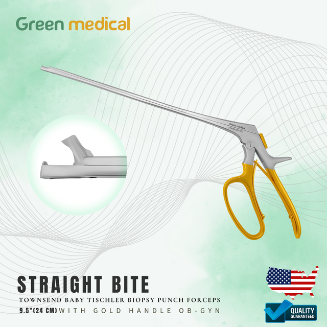 The Townsend Baby Tischler Biopsy Punch Forceps with a gold handle is a specialized surgical instrument typically used in obstetrics and gynecology (OB/GYN) for performing biopsies of delicate tissue. Here's a breakdown of the instrument: